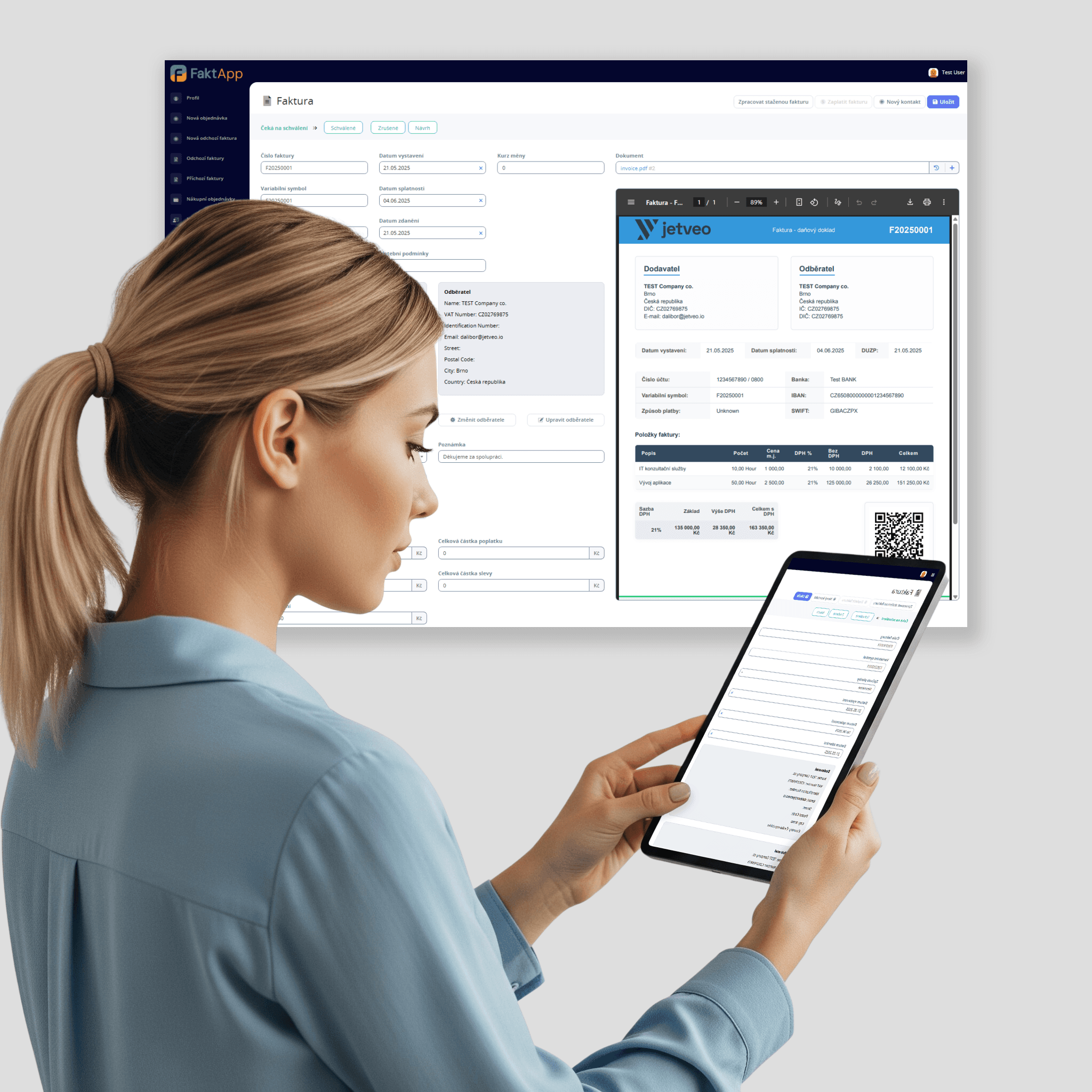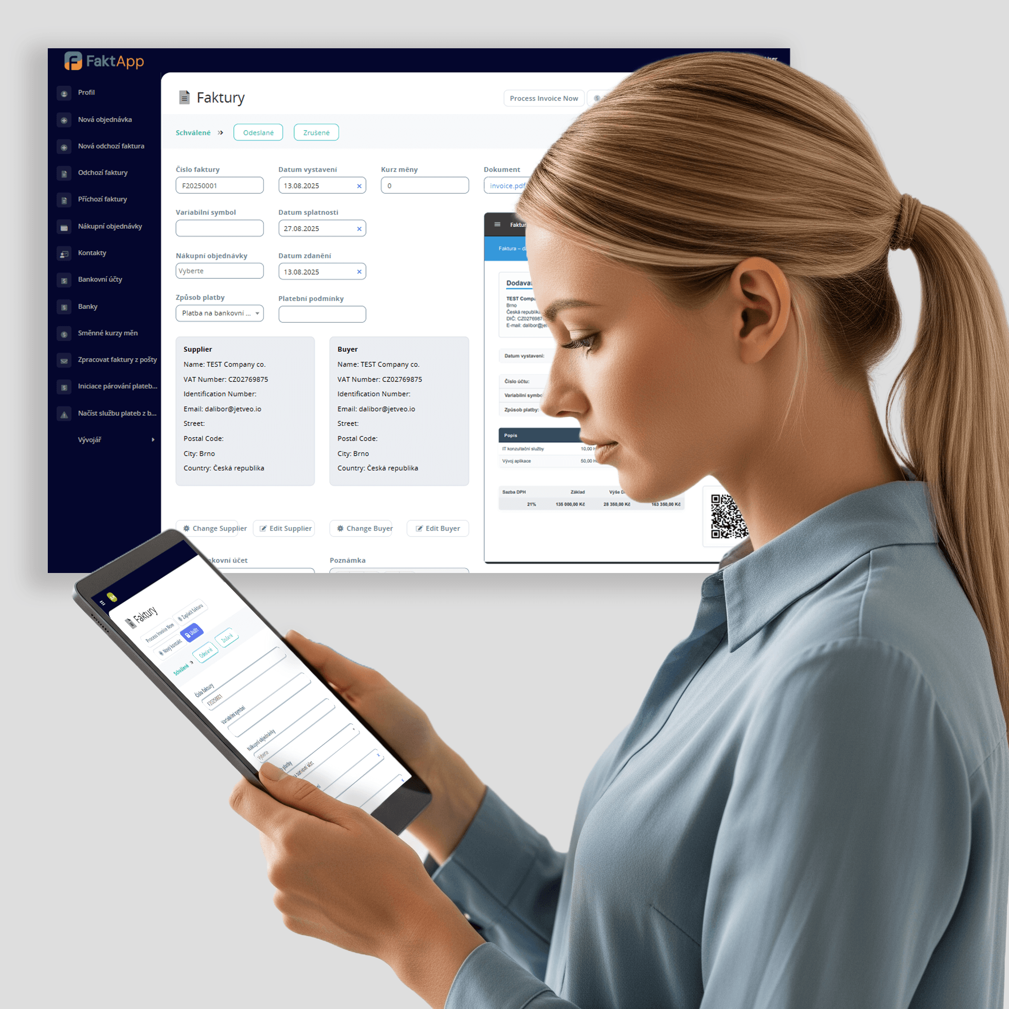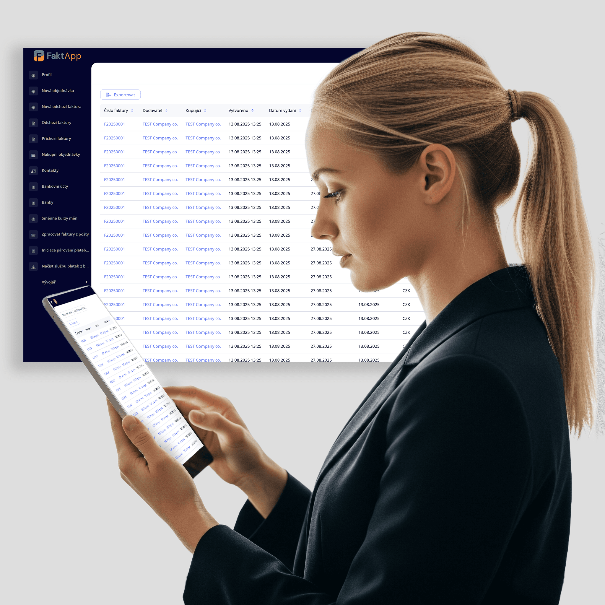 Vystavujte faktury přímo ve FaktAppu – rychle, přehledně a odkudkoliv. Každá faktura obsahuje datovou vrstvu (ISDOC, ZUGFeRD a další EU formáty) a QR kód pro snadné načtení do bankovní aplikace.